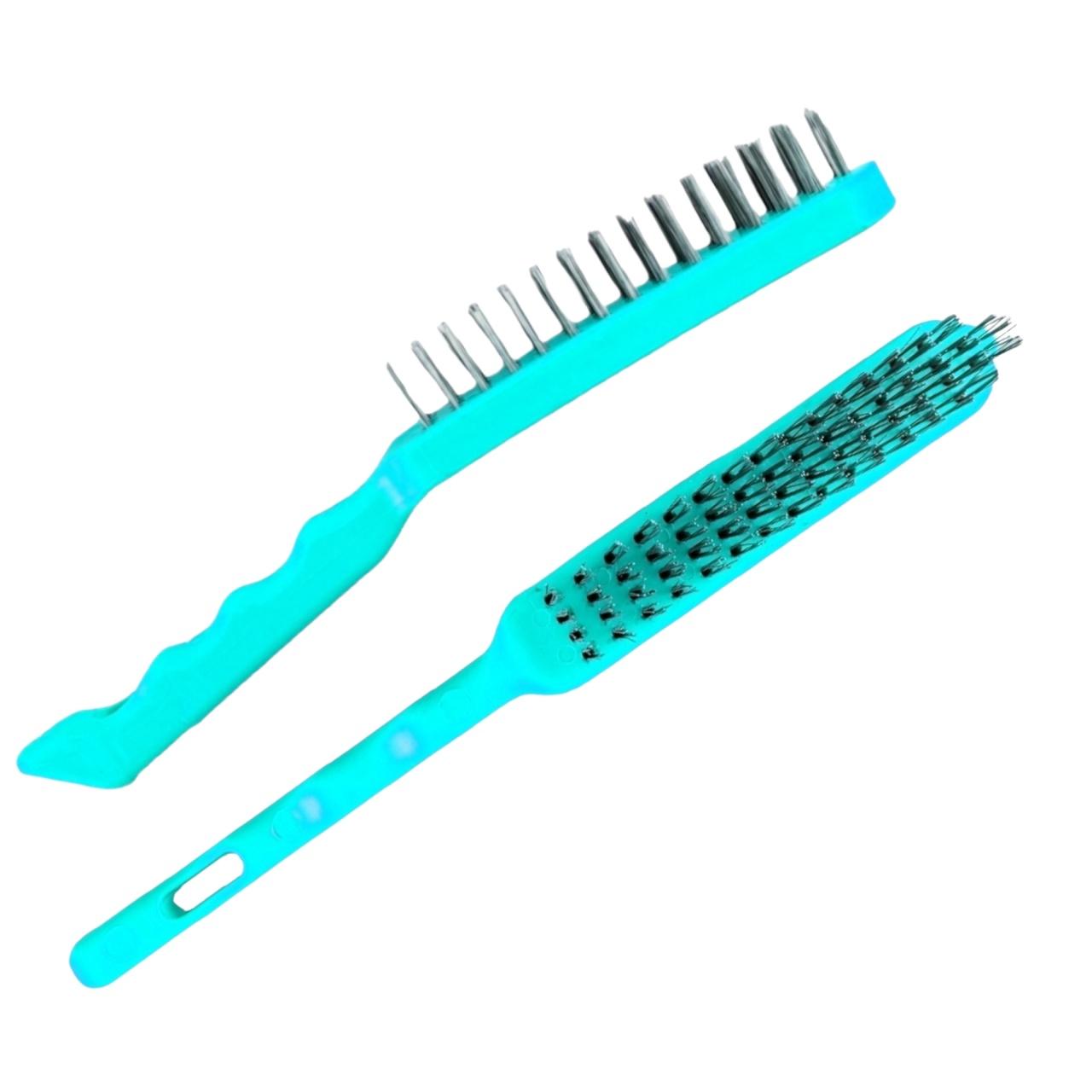 Щетка для зачистки металла в надежном пластиковом каркасе изготовлена из стальной проволоки повышенной прочности, стойкой к воздействию коррозии. Анатомическая форма ручки дополнена отверстием для хранения. Длина щетки с металлической щетиной 12 см, ширина 3 см. Общая длина 22 см. Это эффективный инструмент при снятии лакокрасочных покрытий с изделий из металла и дерева, а также при зачистке поверхностей перед и после сварки.